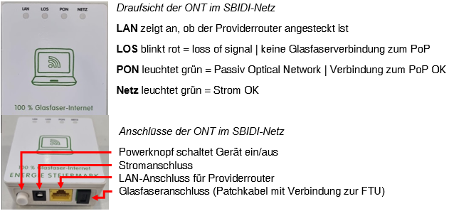 Das ONT (Optical Network Termination) ist der Netzabschlusspunkt des aktiven Netzbetreibers. Hier endet die Verantwortung über den Transport des Internet von Ihrem Internet Service Provider. Bis hier hin steht Ihnen die volle Bandbreite zur Verfügung.